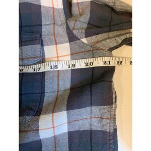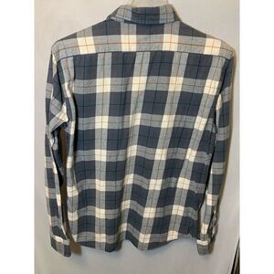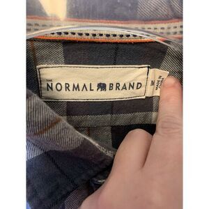 This is a men's button-up shirt from The Normal Brand in size M. It features a gray, white, and orange plaid pattern with long sleeves and a button-down collar style. It is designed for regular sizing and is suitable for casual wear.