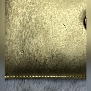 Elegant gold leather wallet perfect for any occasion. Features a sleek design with a stylish clasp. Ideal for adding a touch of luxury to your outfit. Autheric Loewe wallet. Please reflect on photos for clarification of surface light usage & scratches.