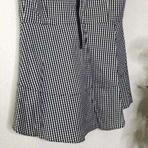 An adorable babydoll style tank top with a tight top and circular skirt bottom. A tiny checkered pattern. Large zipper down the back to get on easy. Layered so not see through. The perfect summer top.