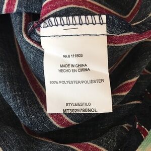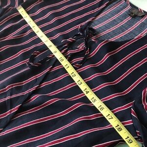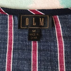 OLM, Stripe Print, Criss Cross Surplice V-Neck With Tie Top. Navy blue with deep red & white stripes. Elastic at hem on waist and sleeves. Size medium. See photos for measurements to ensure fit. NWT