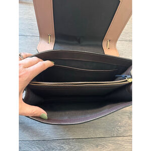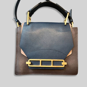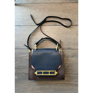 Beautiful ZAC Zac Posen “Katie” Satchel in a rich navy + brown colorblock leather with the signature gold architectural bar hardware.