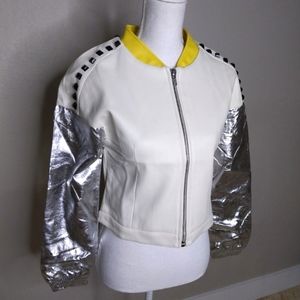Bold statement faux leather jacket by English Rose. Features silver metallic sleeves, studded black shoulders, and a contrasting yellow collar for an edgy standout look. Brand new and perfect for bold, punk, or festival styling.