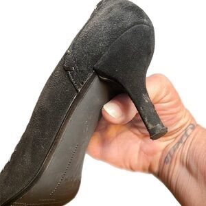 Overall, these heels remain stylish and wearable, with some expected wear from use. A suede brush and light refinishing could further enhance their appearance.