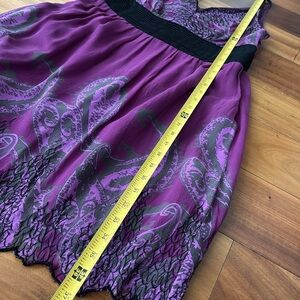 Pretty plum paisley print silk cocktail dress. Scalloped edge. Fully lined. Defined wide black waistband with smocking in the back for a perfect fit. EUC