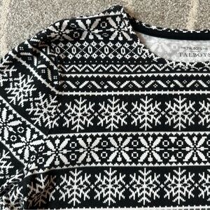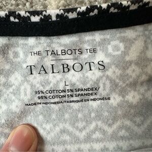 This long sleeve Talbots tee is made of the softest stretchy Jersey fabric. It has a pretty black and white geometric snowflake pattern. In excellent condition. No stains, holes or pilling. 19.5” pit to pit, 25” length, 25” sleeves.