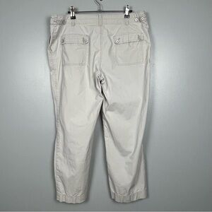Talbots Signature khaki lightweight cotton blend pants, size 12. Front and back pockets, button & zip closure. Good condition with a small flawed area shown in last photo. Approximate measurements 17.5” across waist laying flat, 25” inseam, 10” rise.