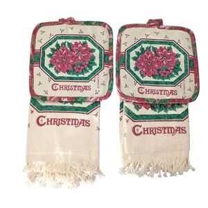 Vintage Franco Christmas Fringed 4 pc Hand Towel Potholder Set Poinsettias