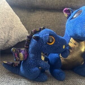 Adorable blue and gold dragon plush toy set. Perfect for collectors or as a gift. Beanie boos Saffire blue dragon plush I want to say it’s a a 4&6 inch set.