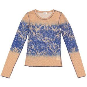 WILFRED Aritzia Sheer Mesh Long Sleeve Graphic Top Sz XXS Nude Blue