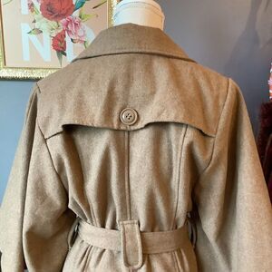 Adorable, coffee and cream colored, belted jacket. Jacket buttons in front and inside. Fully lined. Cute bell like sleeves hit at elbows. Love this look! Poly/wool. Size medium.