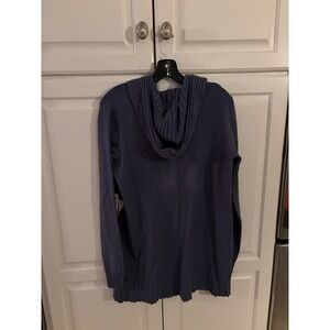 Keywords: Red Hummy Yarn, hooded cardigan, open front cardigan, ribbed cardigan, pockets, knitwear, rayon blend, casual sweater, women's sweater, medium, blue cardigan, new with tags, cozy cardigan, fall sweater