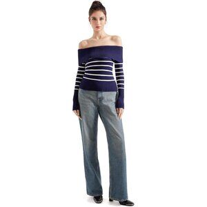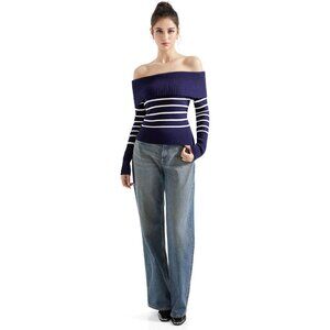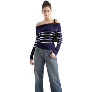 Women Blue White Off Shoulder Long Sleeve Tops Blouse Sweaters