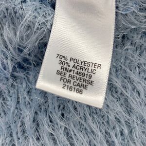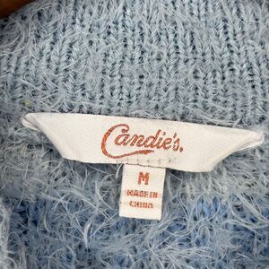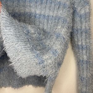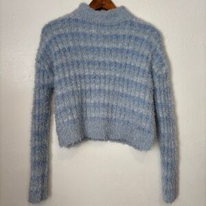 Candie's Crop Mock Neck Fuzzy Eyelash Fur Fabric Knit Sweater Blue Stripe Medium