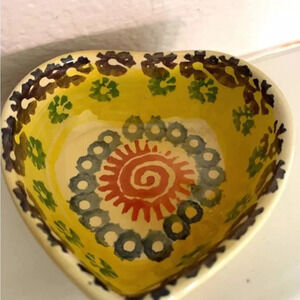 This vintage Italian pottery heart bowl set is a beautiful addition to any collection. The unique pattern and pottery production technique make it a one-of-a-kind piece. The bowl may be unmarked, but its quality and craftsmanship speak for themselves. Perfect for decorative use or as a functional piece of serveware, this heart bowl is sure to add a touch of charm to any setting.