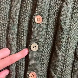 Classic cable knit design. Button-up front cardigan. Perfect for layering. 100% virgin wool.