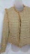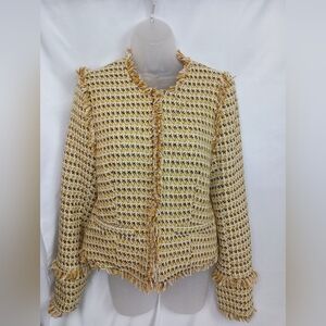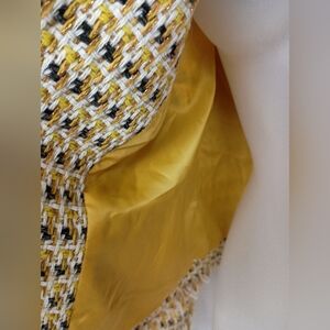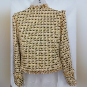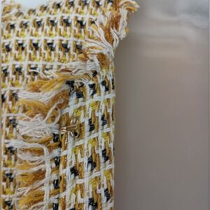 Threads of yellow, black, white, and metallic gold make up a sturdy tweed composition that constructs a collarless neckline, and long sleeves with fringe details at the shoulders and cuffs. Additional fringe trims the boxy, straight-cut bodice complete with hidden hook closures, twin welted pockets. and a slightly cropped hem.