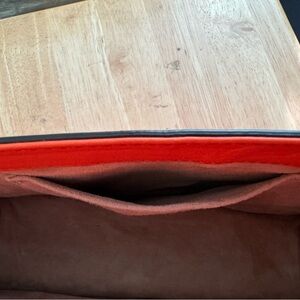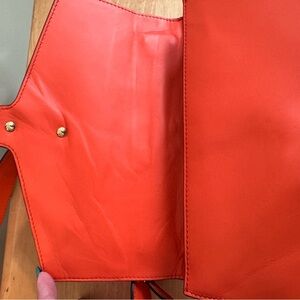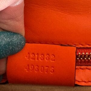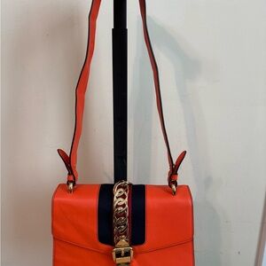 Elevate your style with this vibrant orange leather shoulder bag from Gucci. Featuring a striking gold chain detail, this bag is perfect for adding a pop of color to any outfit. Serial No: 421882-498076; Size: 6.25x10x3”; Style Shoulder Bag; Comes with crossbody strap; Exterior color is vibrant, no color transfer; Leather is wrinkled (I think from how it was stored); Interior is clean, no smell