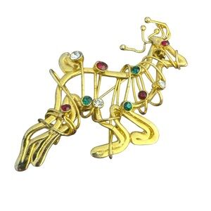 This exquisite gold reindeer brooch features vibrant red, green, and white accents, perfect for adding a festive touch to any outfit. A stunning piece for any jewelry collection.