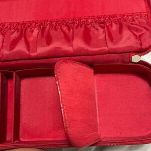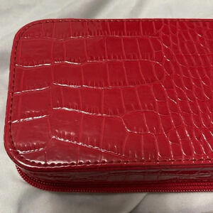 This Vintage Liz Claiborne Signature Red Faux Croc Print Jewelry Travel Bag is perfect for traveling with style while staying organized. Its approximate measurements are 11.25” length x 4” width x 1.75” height. It is in like new condition without tears or peeling and the hardware is nearly flawless. This is a beautifully maintained travel accessory.