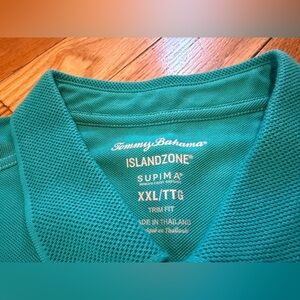 Tommy Bahama Island Zone men’s teal blue/green polo shirt, size XXL/Trim Fit. Cotton blend. EUC. No rips, holes, stains or odors. Please see photos for item details/dimensions. Some photos may appear different in color due to lighting. 2nd picture in listing is most accurate in color. Ships from smoke-free home.