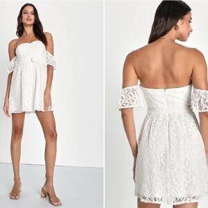 Pour some prosecco and grab your girlfriends, because the Lulus Inspired Cutie White Lace Off-the-Shoulder Mini Dress is ready for a day full of fun! Romantic floral lace (atop a matching knit liner) shapes this adorable dress that features a princess-seamed bodice with supportive boning throughout and a sweetheart neckline (with hidden no-slip strips), framed by fluttery off-the-shoulder sleeves. The high, fitted waist features a matching tying sash, that tops a twirly skater-style skirt that finishes at a flirty mini hem. Hidden back zipper/clasp.