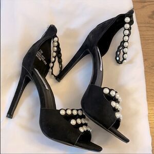 CAPE ROBBIN BLACK MICROFIBER SANDALS WITH “PEARL” DETAILING. 4.5 INCH HEELS. THESE SANDALS ARE LIGHTWEIGHT AND NICELY PADDED FOR COMFORT. CUTE AND COMFY. NEW. REGULAR PRICE $44