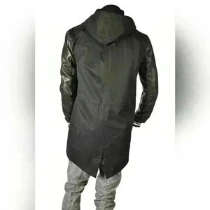 There's a lot going on with this stunning hooded fishtail jacket by Mackage. Featuring a detachable hood and crafted from cotton twill on the body and sumptuous lambskin leather sleeves it also has an inner cinch to tighten the waist. Size 38/Medium