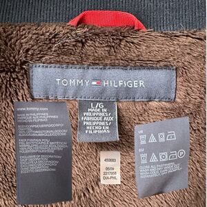 This is a very warm sweatshirt-jacket! It's fully lined, sleeves included, with plush faux fur in contrast brown color. High collar has stripes on the inside. Front pockets, Tommy logo on cuff, metal full zip closure.