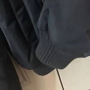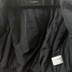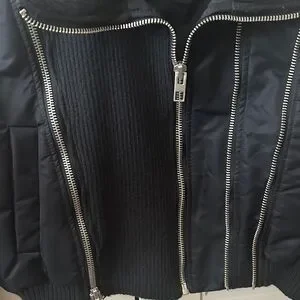 Stylish cropped jacket. Features ribbed collar and zip closure. Perfect for layering.