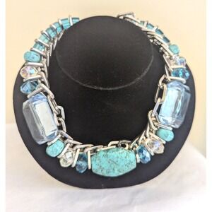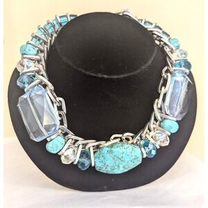 STUNNER DESIGNER NECKLACE, large oval center turquoise stone with two huge large emerald cut Lucite pieces along with cube cut Lucite and glass crystals, heavy silver tone oval links that have a chrome look. Not an ordinary piece. Necklace is heavy weighing over 1/2 pound, stones are ice cold to the touch. Collar length at 17" with a 2" chain extender, large oval center stone measures 1 1/2" in width and the huge emerald cut Lucite rectangular pieces measure 1 1/4" x 1 1/4". Just a stunner designer statement necklace.