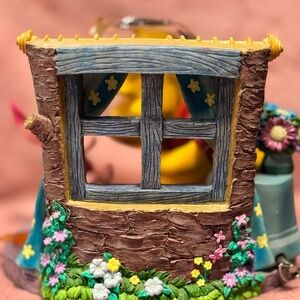 Charming Disney figurine featuring Winnie the Pooh and Piglet. Pooh is in a yellow outfit with a red shirt. Piglet is in pink. Perfect for Disney fans.