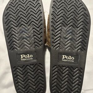 Stylish Polo by Ralph Lauren sandals. Features brown strap with logo. Comfortable black sole.