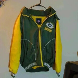 This is a vintage Green Bay Packers wint r jacket with a detachable hood made by NFL Apparel.