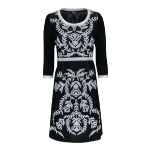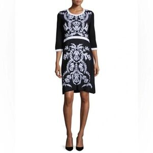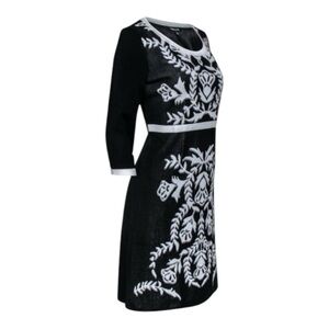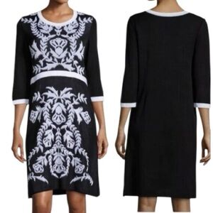 Misook Black & White Knit Dress Medium Embroidered Floral Pattern Work Elegant