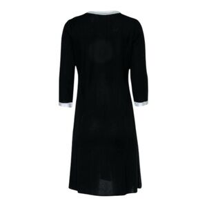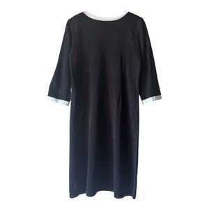 Elegant and timeless Misook black knit dress featuring intricate white embroidered floral design. Crafted in a soft stretch knit with 3/4 sleeves and a flattering knee-length silhouette — perfect for office to evening.
