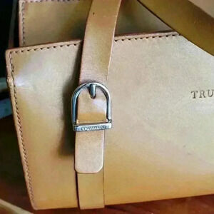 ● This is a beautiful and durable classic Trussardi small bag in a smooth camel Italian leather with "Trussardi" imprinted hardware and contact stitching