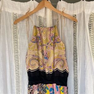 Pink, Yellow, Blue, Light Green and Black Mixed Prints in Scarf Dress including Floral, Paisley, and Birds taking off scene. Spaghetti straps that tie on shoulder.