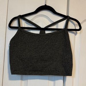 Stylish gray longline aerie sports bra with strappy back design. Perfect for casual wear.