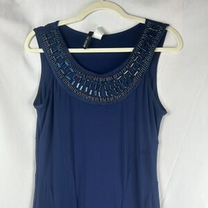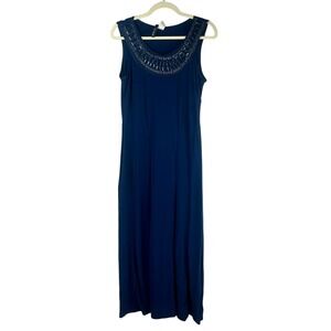 Nick & Dom Jersey Knit Maxi Dress Women Medium Navy Blue Beaded Neck Stretch