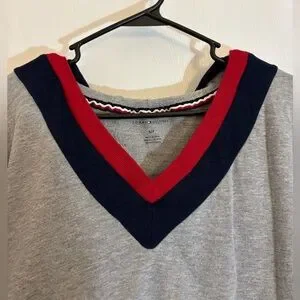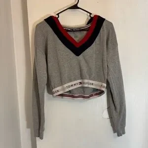 Cute gray cropped hoodie with Tommy Hilfiger logo on the hem and blue & red v neck. Womans size small