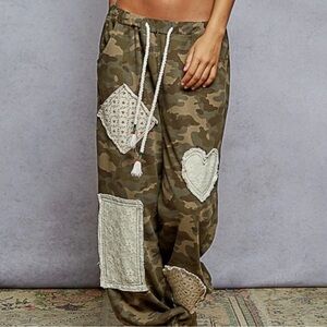 Stylish camouflage pants with unique cream patchwork. Comfortable drawstring waist. Perfect for casual wear.