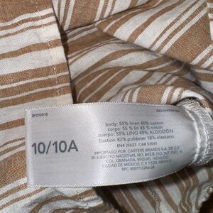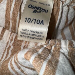 This Oshkosh B’gosh Girls Size 10 Striped Off Shoulder Romper is a stylish and versatile one-piece garment perfect for various occasions like travel, parties, or casual wear. Made of a blend of linen and cotton, this romper features a striped pattern in tan color, with half sleeves and adjustable straps for a comfortable fit. The elastic waist adds a touch of convenience, while the off-shoulder style and bohemian beach theme make it a trendy choice for the summer or spring season. Ideal for young girls looking for a fashionable and easy-to-care-for outfit.