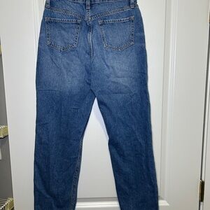These Old Navy blue jeans feature a classic straight-leg design with a medium to light wash, offering a casual and slightly worn look. The denim fabric showcases a woven texture with varying blue tones, adding depth and character to the jeans. Perfect for everyday wear, these jeans provide a timeless style that complements any casual outfit.
