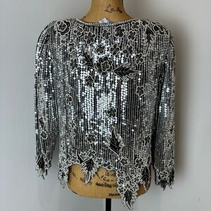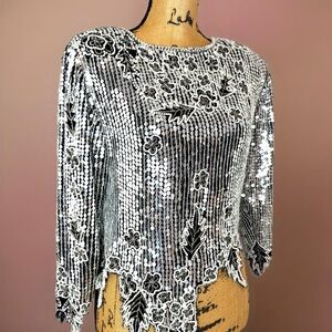 100% SILK vintage GUNIT silver sequin long sleeve top embroidered floral party
