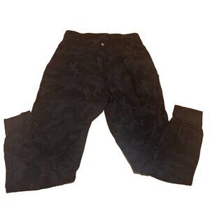 Lululemon Align Jogger in size 8, featuring an Incognito Camo Multi Grey pattern. These pull-on leggings are made of Nulu fabric, offering a comfortable and stretchy fit with a waist size of 27 inches and inseam of 28 inches. They have a jogger style with pockets, are machine washable, and breathable. The sold-out item from the Lululemon Align product line is ideal for active women seeking both style and performance. 10" Rise. Used condition. Have lots of wear left!