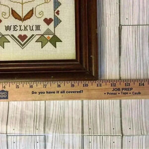Vintage. Framed floral Cottagecore Amish cross stitch embroidered “Welkum”.