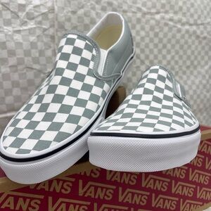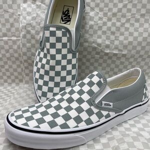 Vans slip-ons with a gray and white checkered design. Easy to wear and stylish.