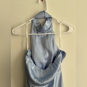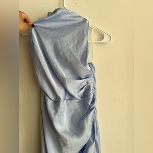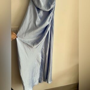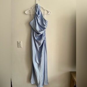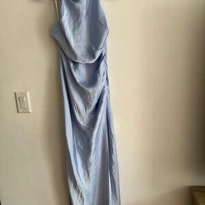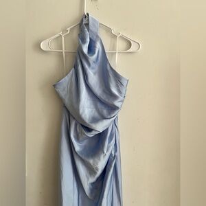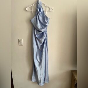 Sibella The Label gown, designed for elegance and timeless sophistication. Made from a silky satin-like fabric, this dress features a draped halter neckline with button closure, a flattering gathered bodice, and a high side slit that adds a touch of modern allure. Perfect for weddings, evening parties, or special events.