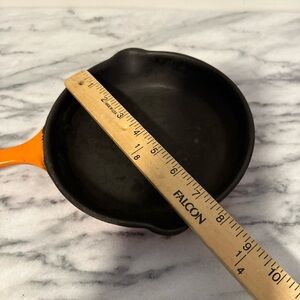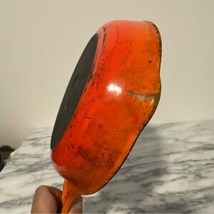 Le Creuset cast iron skillet. Features a striking orange handle. Ideal for versatile cooking.