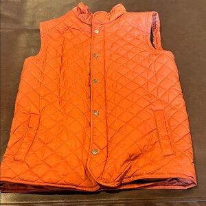 Bright orange quilted vest. Snap button closure. Sleeveless design. Perfect for layering.